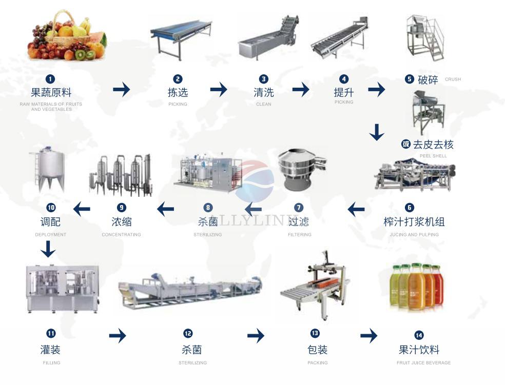 整套水果深加工果汁飲料生產(chǎn)線工藝流程: